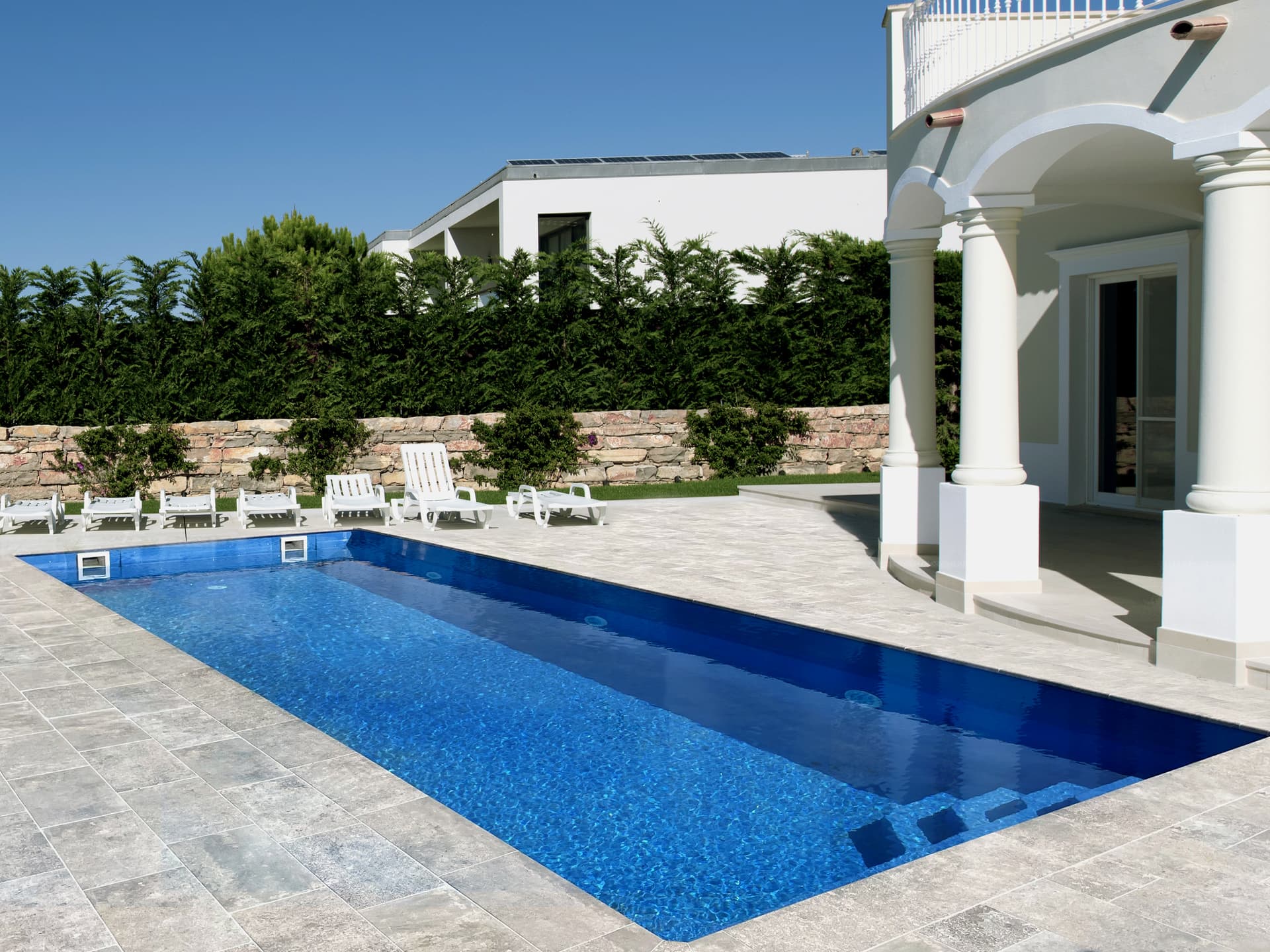 Az AMPRON rolós medencék esetén a medenceformában rejtett takaróház kerül kialakításra. Ez a medence hátsó felében esztétikus ülőpad formájában látható.