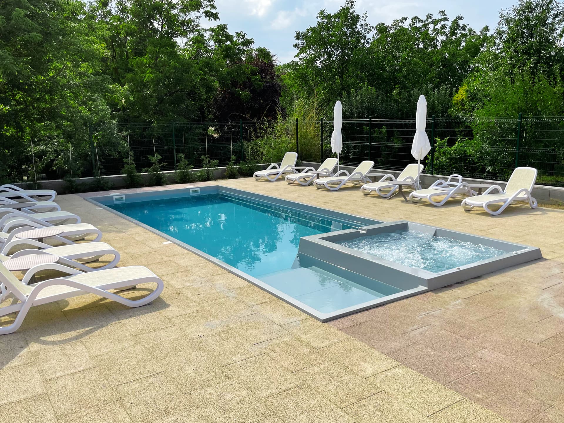 Úszómedence és egész évben üzemeltethető jakuzzi letisztult egyedi stílusban