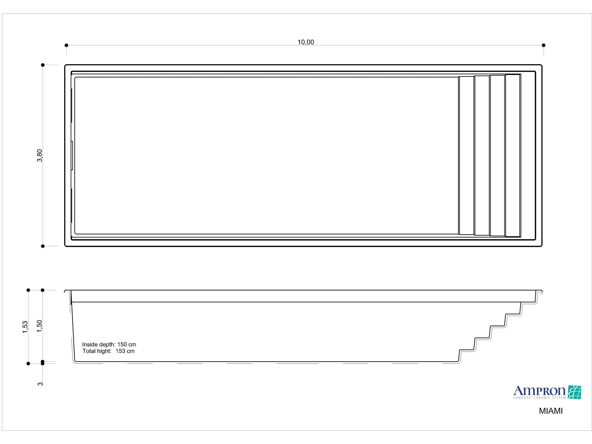 Impozáns megjelenés, klasszikus elegancia, egyenes vonalvezetés és maximális térkihasználás jellemzi a MIAMI medencét, mely minden környezetben megállja a helyét. Ideális választás családoknak vagy kimondottan nagy térrel rendelkezőknek. A biztonságos belépést egyenes vonalú, a medence teljes szélességében futó, csúszásmentes széles lépcsősor biztosítja, mely kényelmes ülőpadként is szolgál. Ellenáramoltatóval is felszerelhető.
