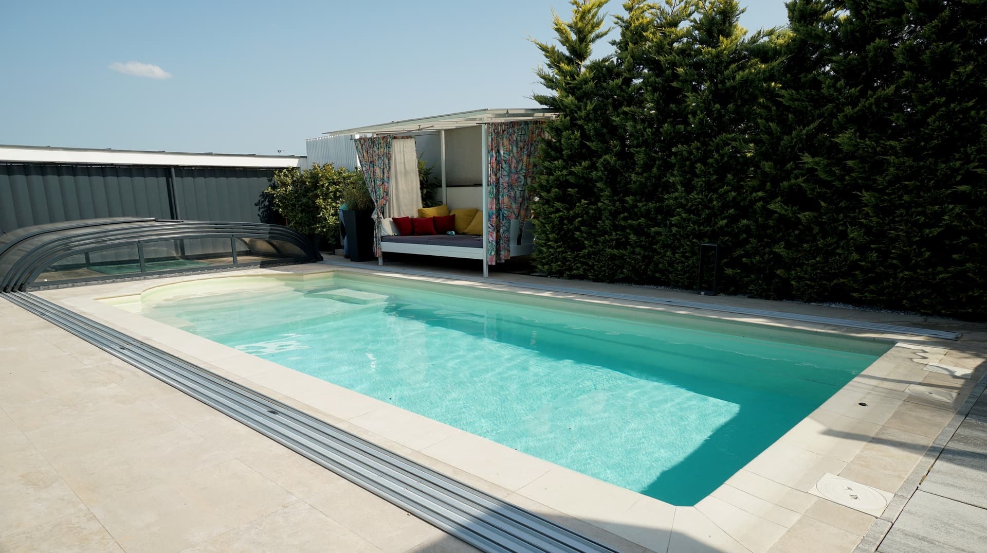 Az AMPRON rolós medencék esetén a medenceformában rejtett takaróház kerül kialakításra. Ez a medence hátsó felében esztétikus ülőpad formájában látható.