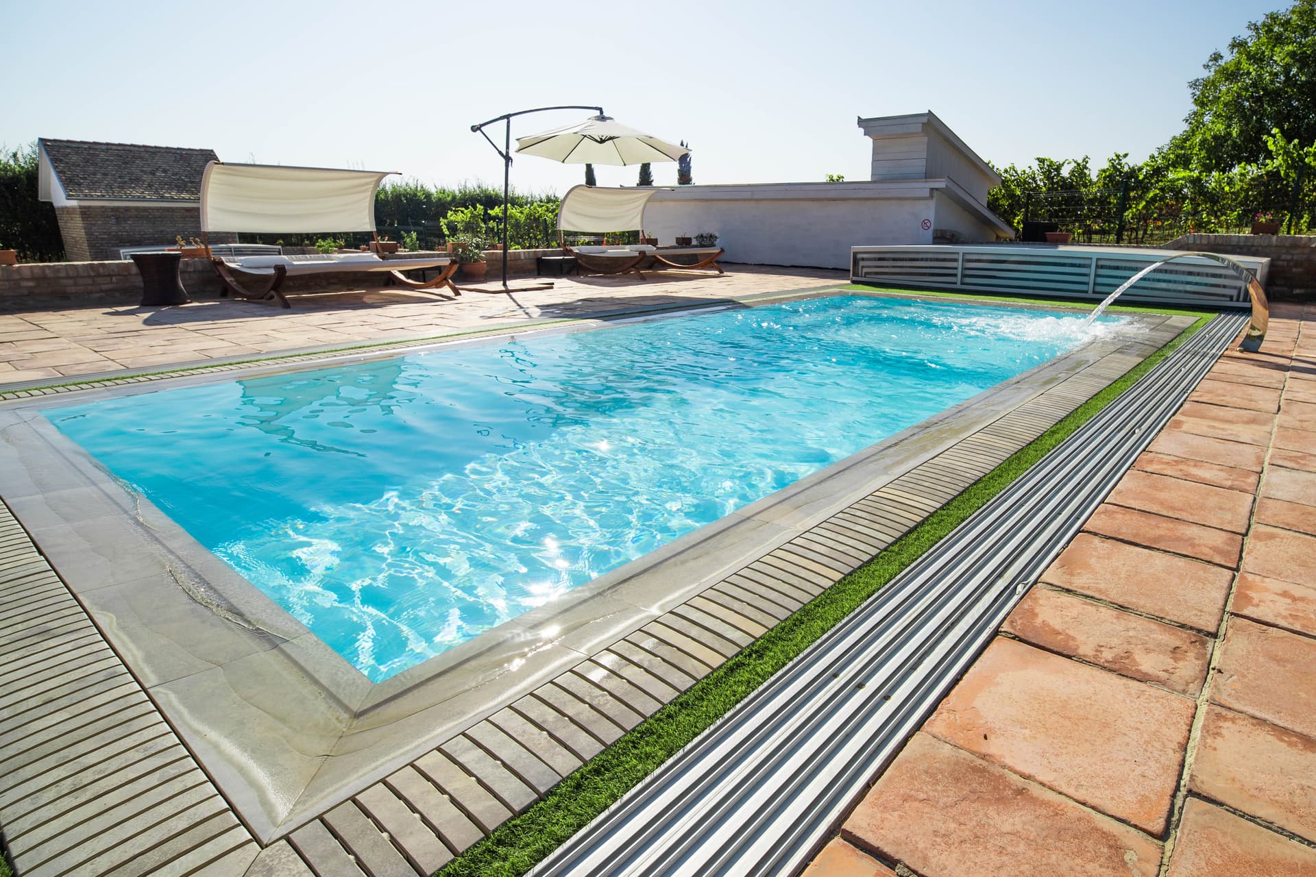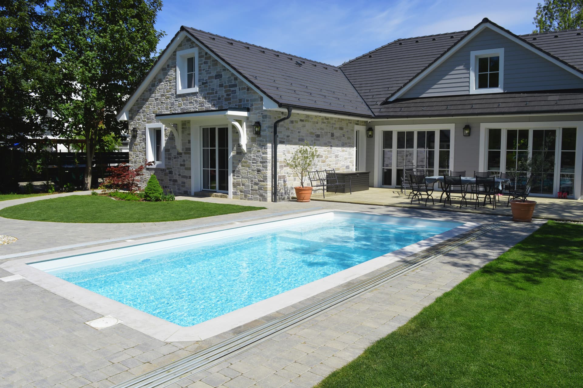 Az AMPRON rolós medencék esetén a medenceformában rejtett takaróház kerül kialakításra. Ez a medence hátsó felében esztétikus ülőpad formájában látható.