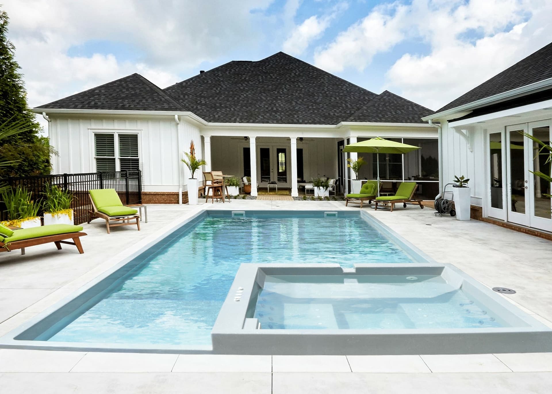 Úszómedence és egész évben üzemeltethető jakuzzi letisztult egyedi stílusban